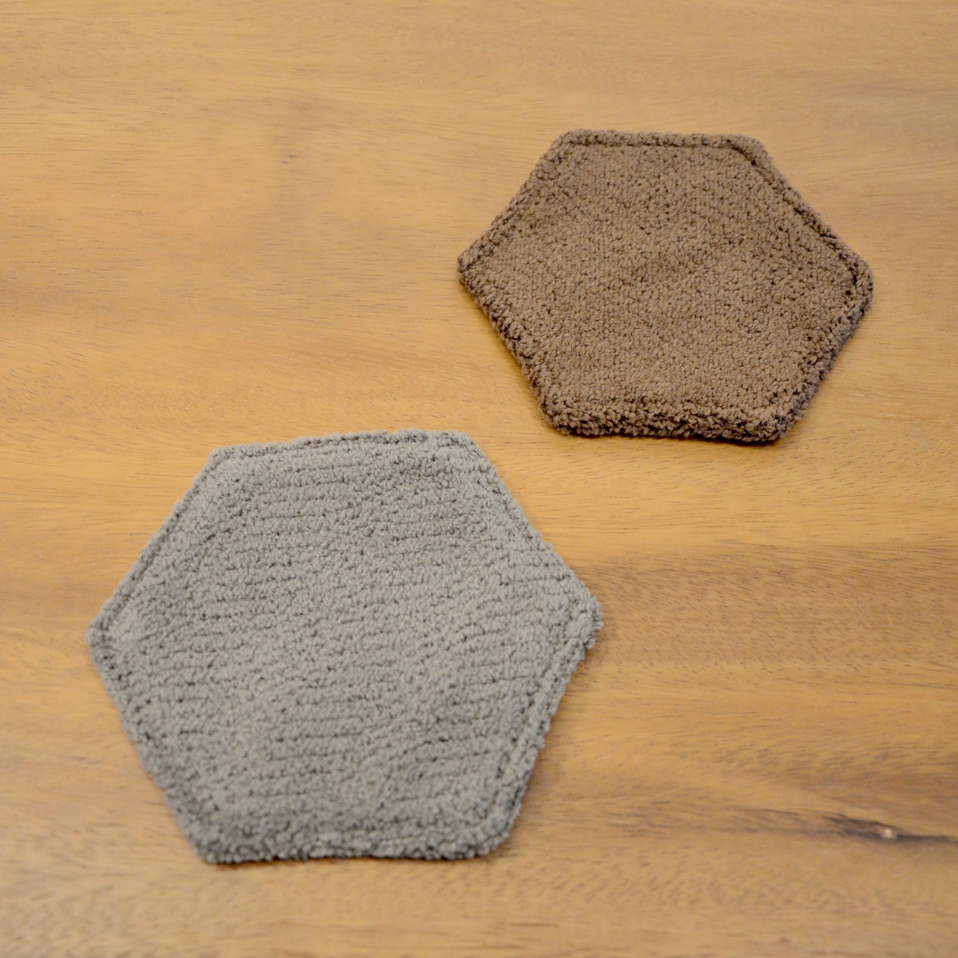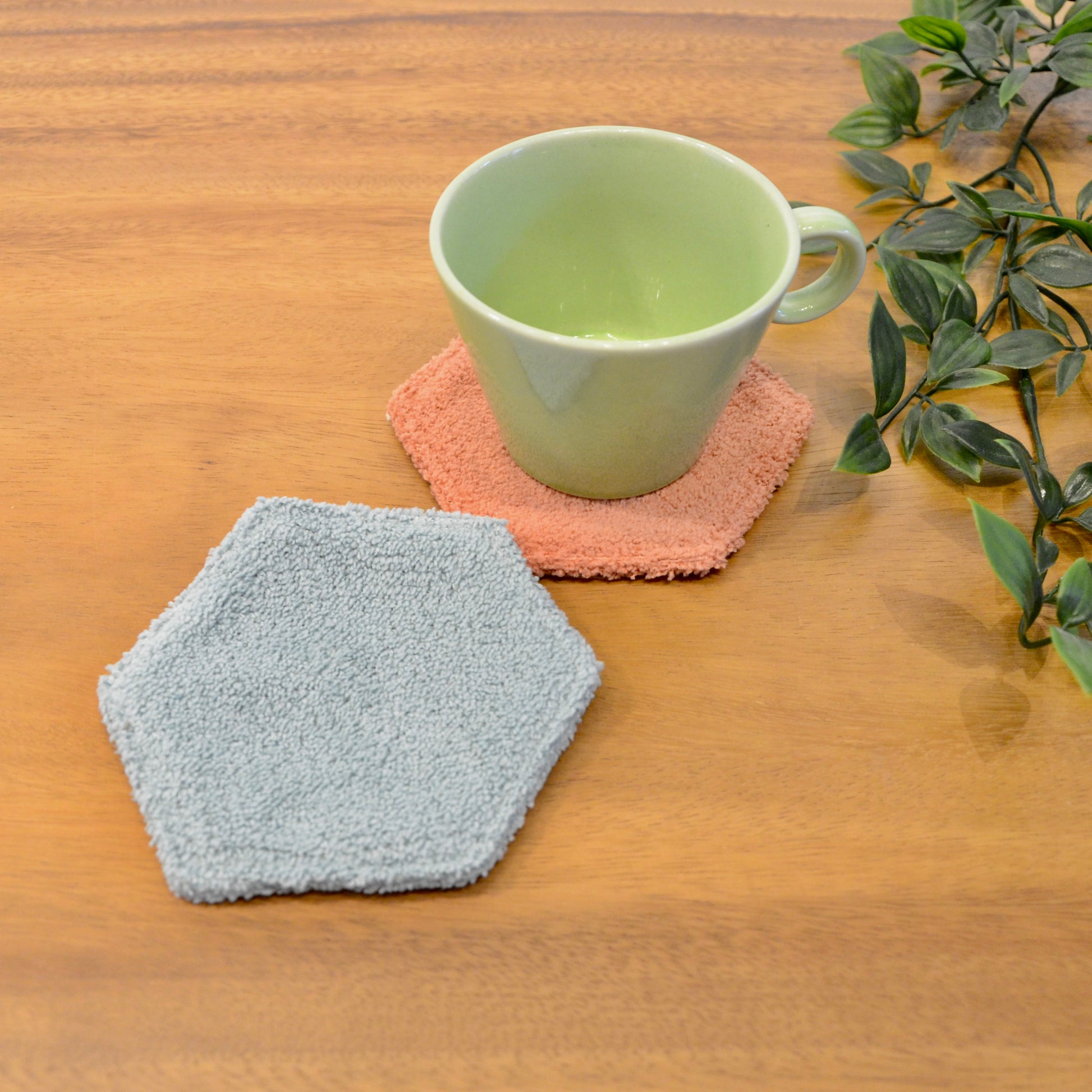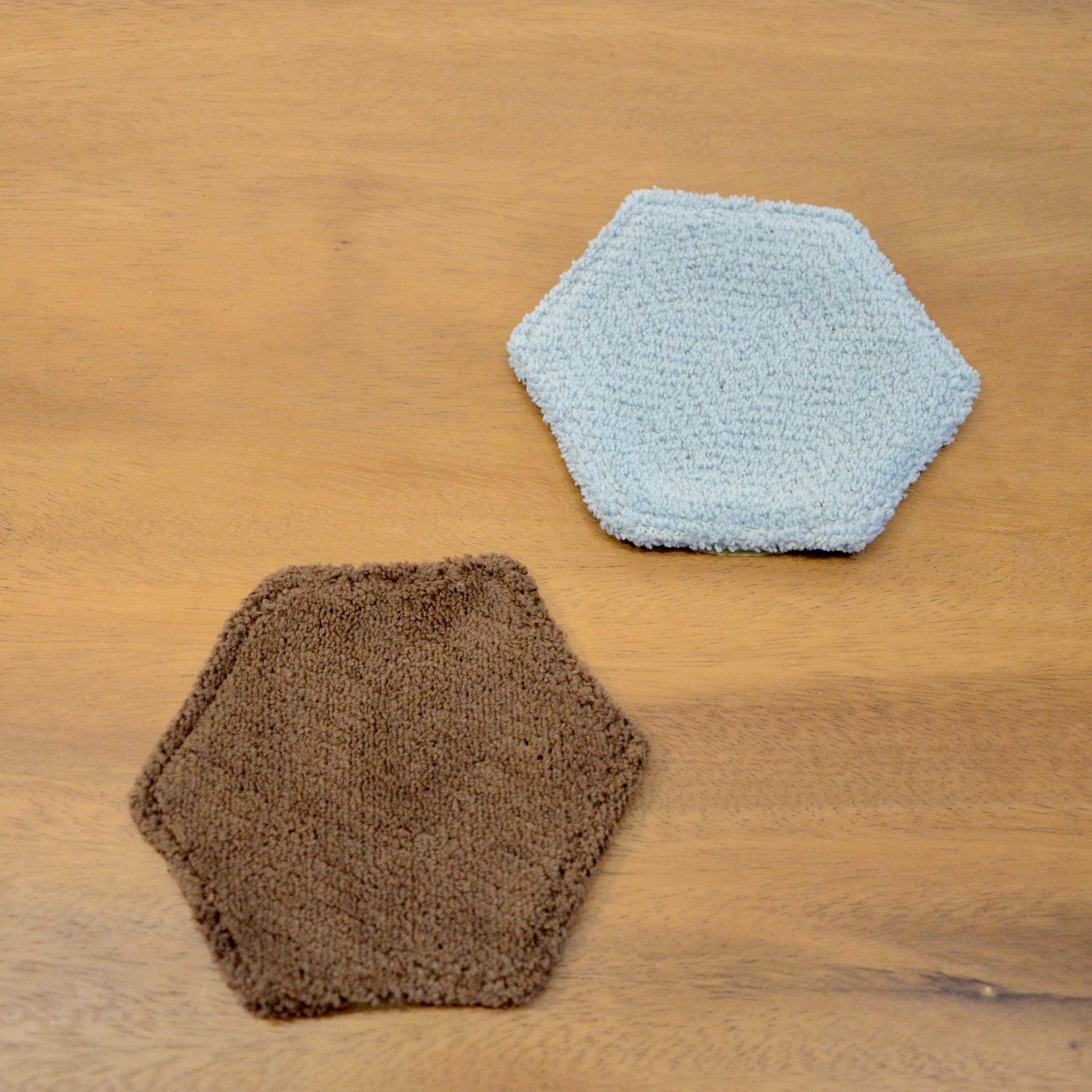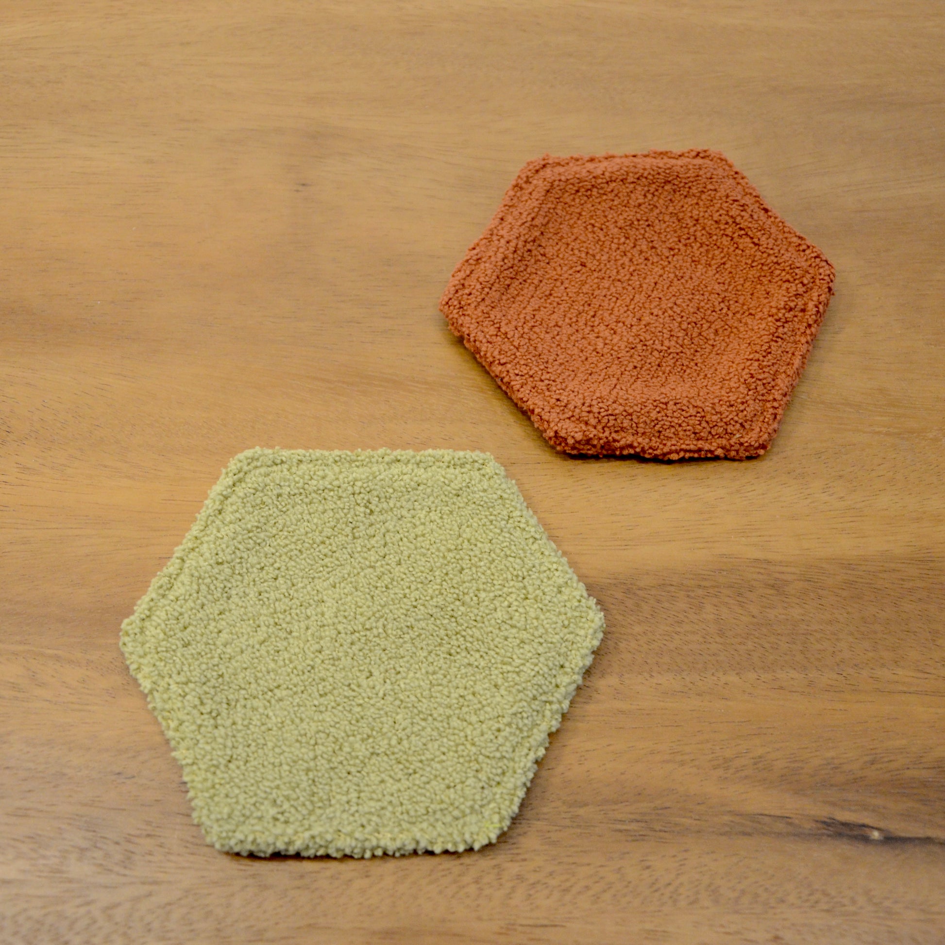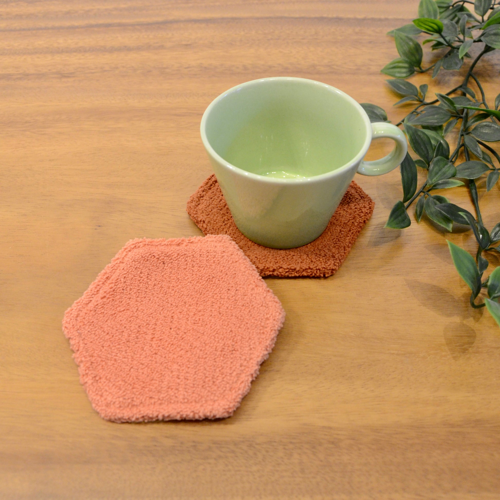 モンペスツールの座面部分と同じ柔らか〜い生地で出来ています。 裏面も同じ色の六角形のコースターです!暮らしにお好きな彩りを添えてみてくださいね。